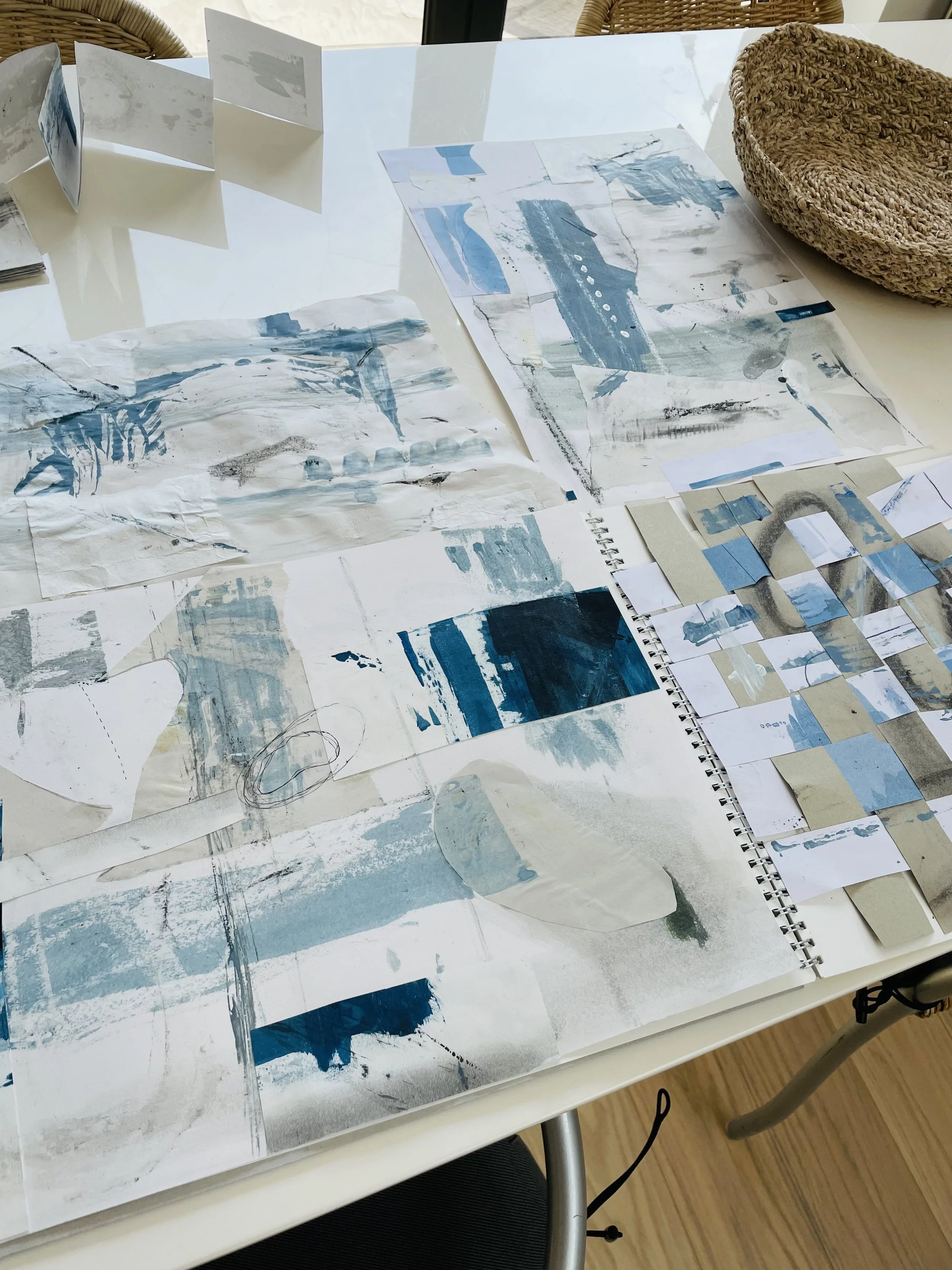 My Scottish art studio is tucked away behind a hidden, secret door. A white, timber panelled space, it is flooded with natural light from four sky light windows. There are woollen blankets for chilly days and a vintage architect’s drawing board, along with an array of art materials, paints, inks and brushes. I work surrounded by my treasures such as pebbles, grasses, driftwood and sea glass. A beautiful tranquil place to create natural moments of calmness within my artworks.